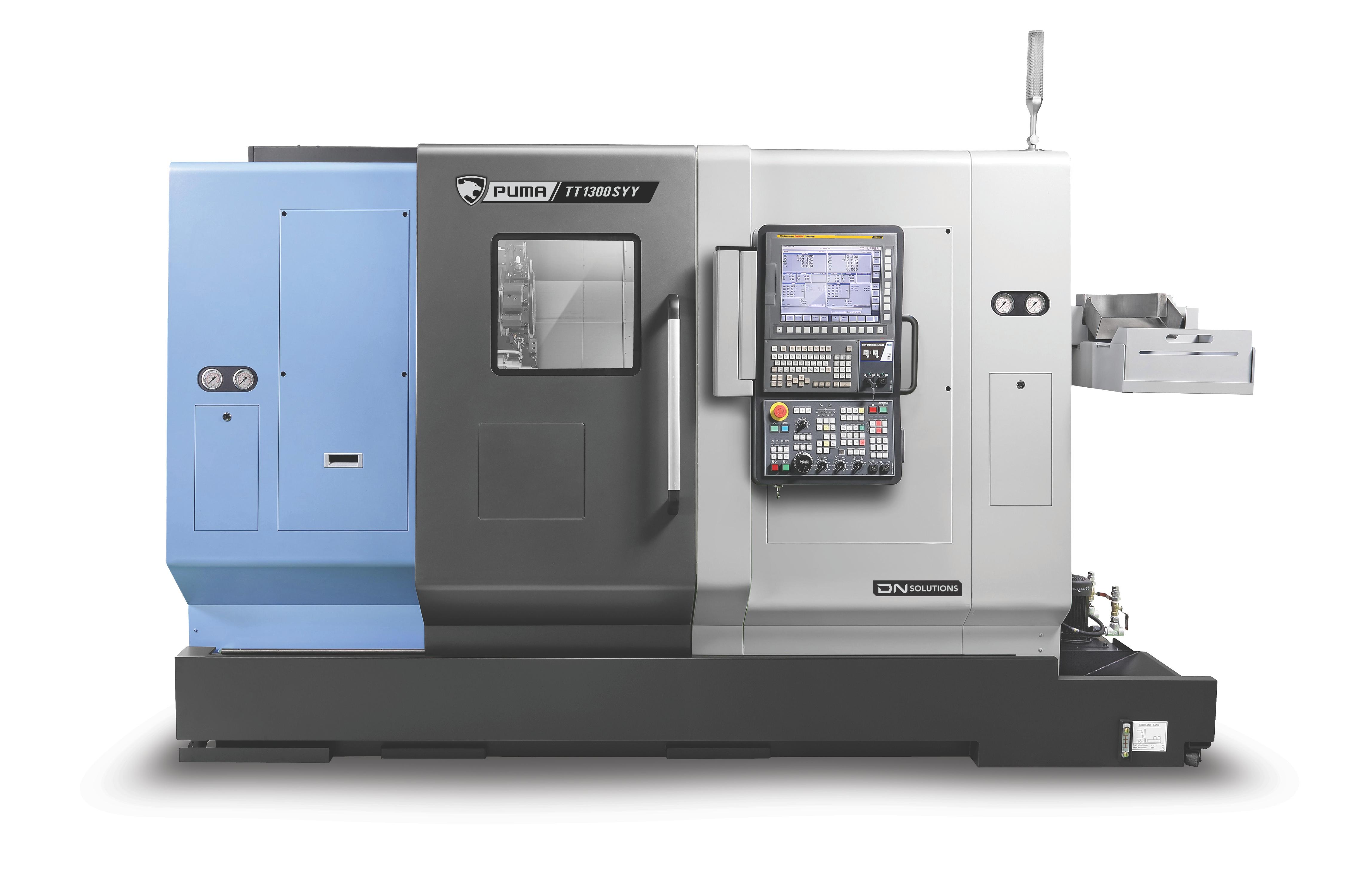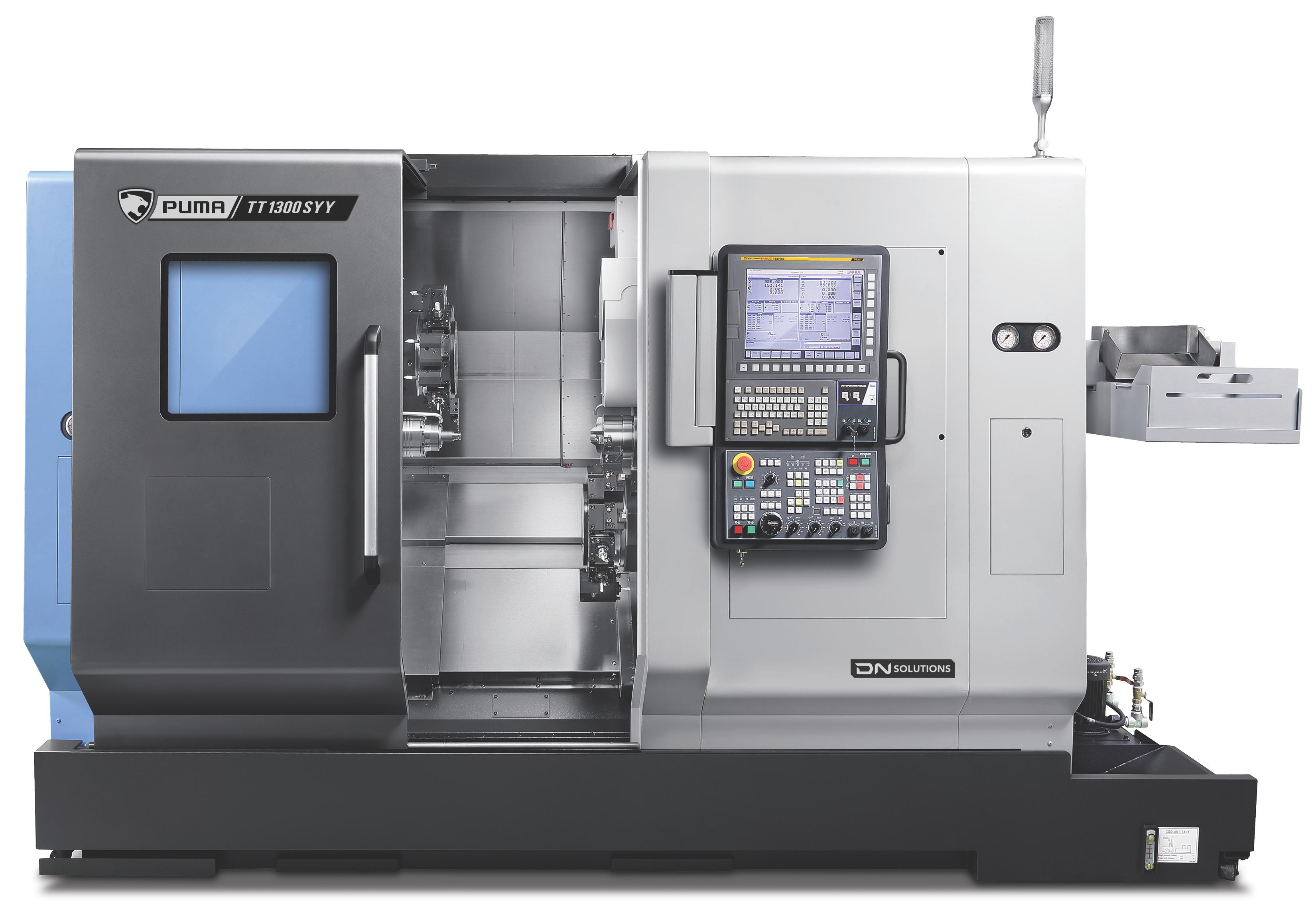 The PUMA TT1300, TT1800, TT2100, and TT2500 series are high-productivity horizontal turning centers with bar capacities ranging from 42mm to 81mm. These machines are equipped with twin opposed spindles and upper/lower turrets, featuring Y-axis capabilities for simultaneous two-face machining. Both spindles have equal power and capacity, allowing independent operation and automatic workpiece ejection, significantly enhancing productivity. Favored globally, the PUMA TT series is renowned for its best-in-class performance and reliability, making it one of DN Solutions' top-selling products. |