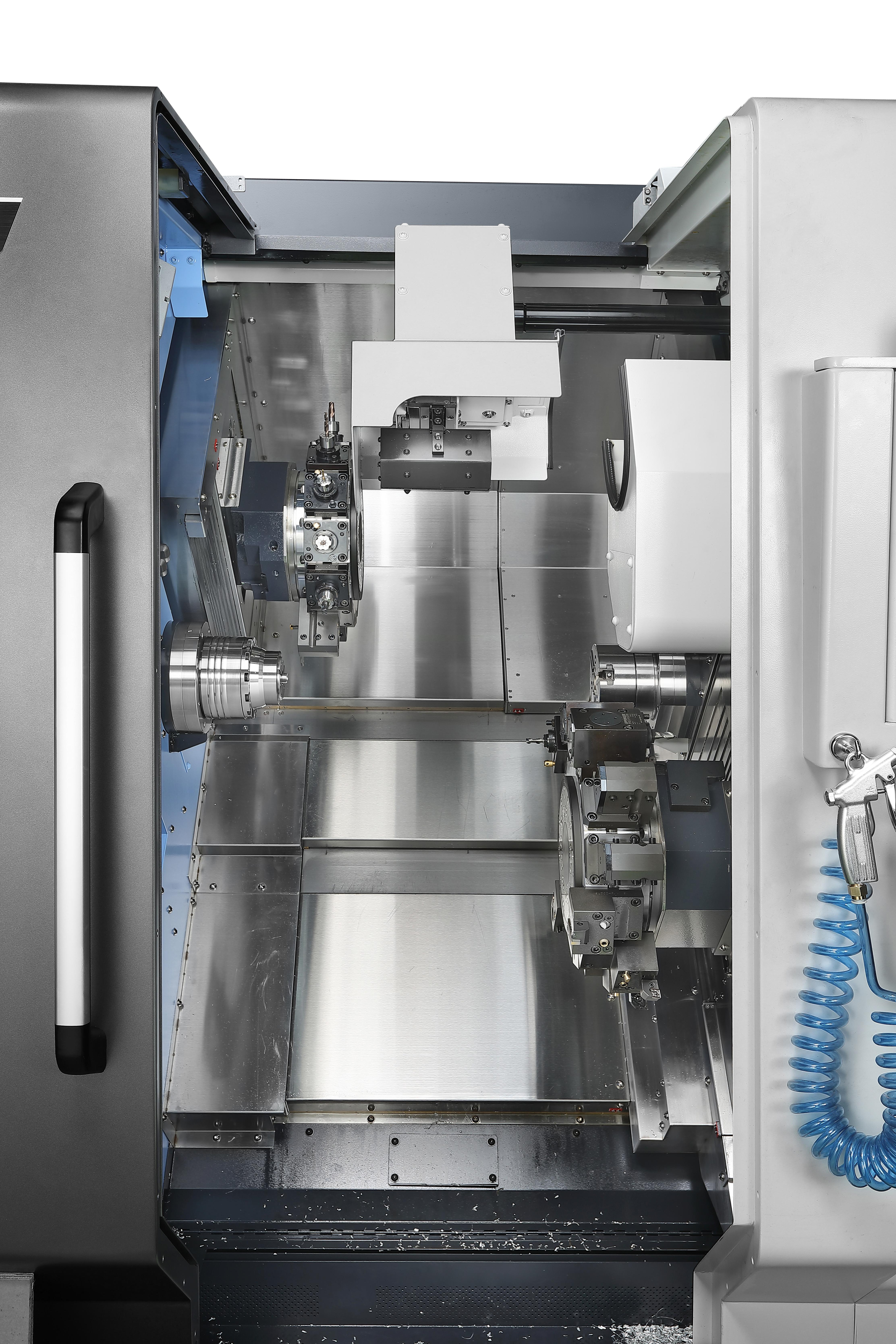 - Dual Spindle Efficiency: Twin opposed spindles with equal power allow simultaneous machining on two faces, significantly increasing productivity.