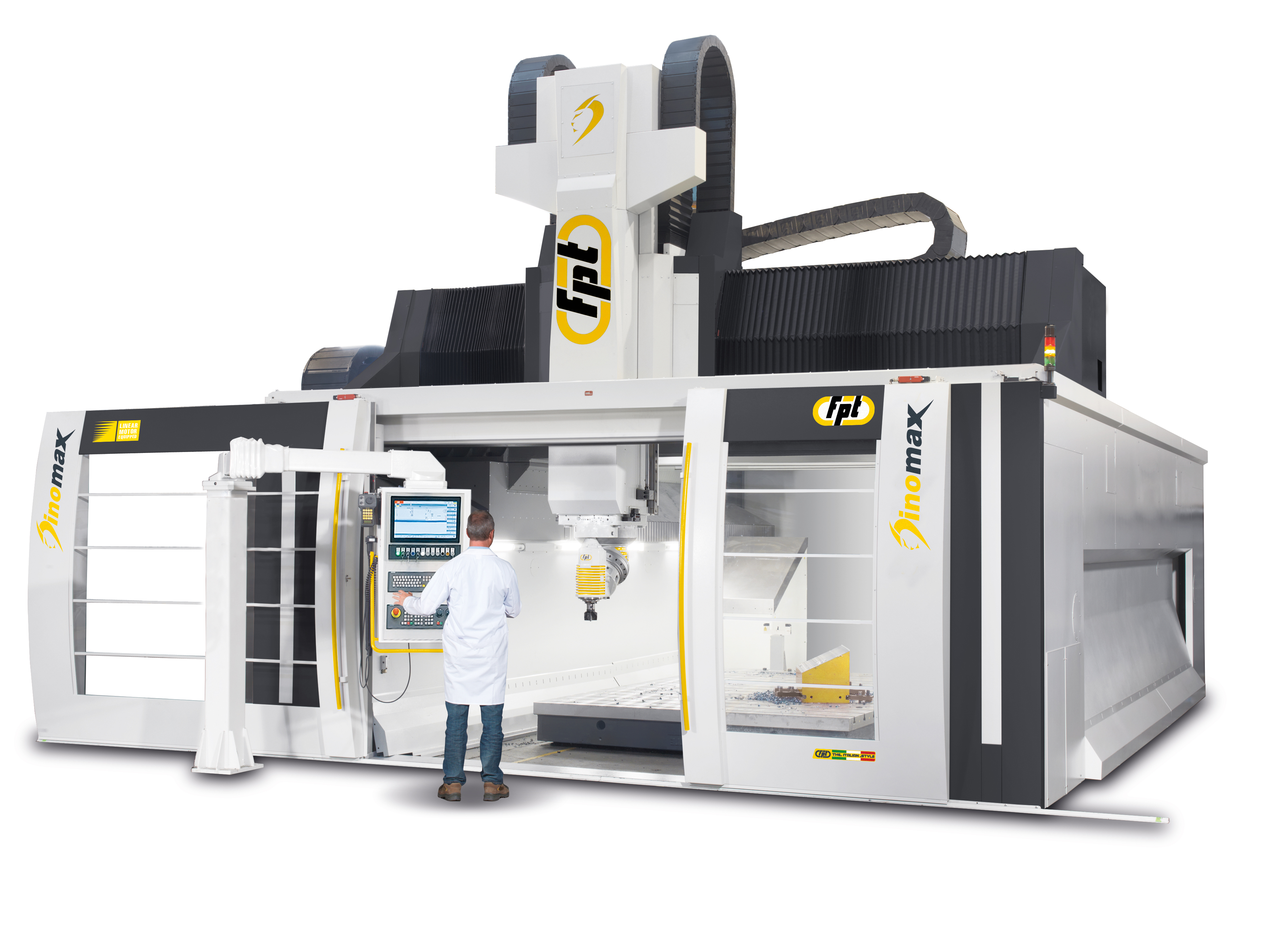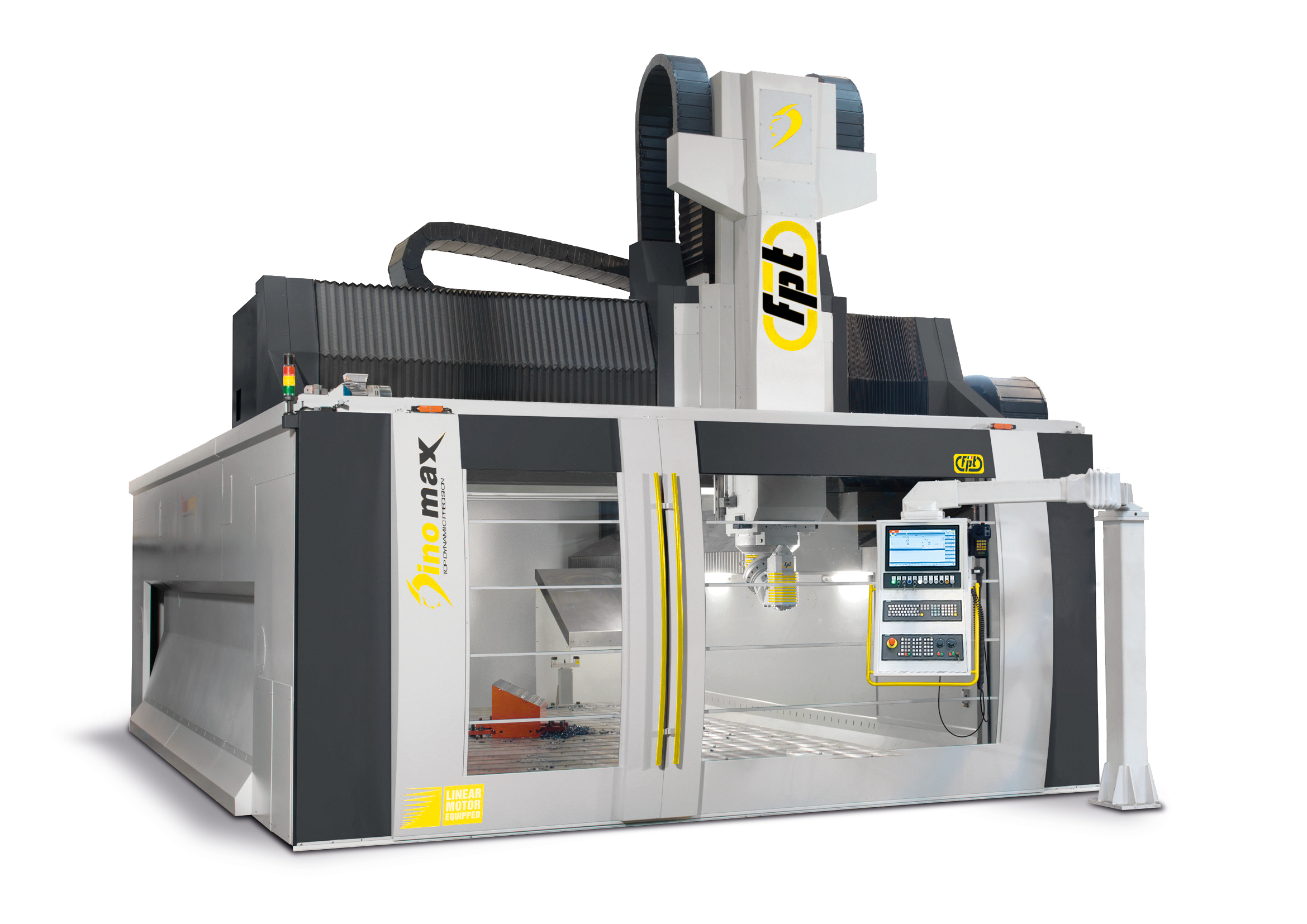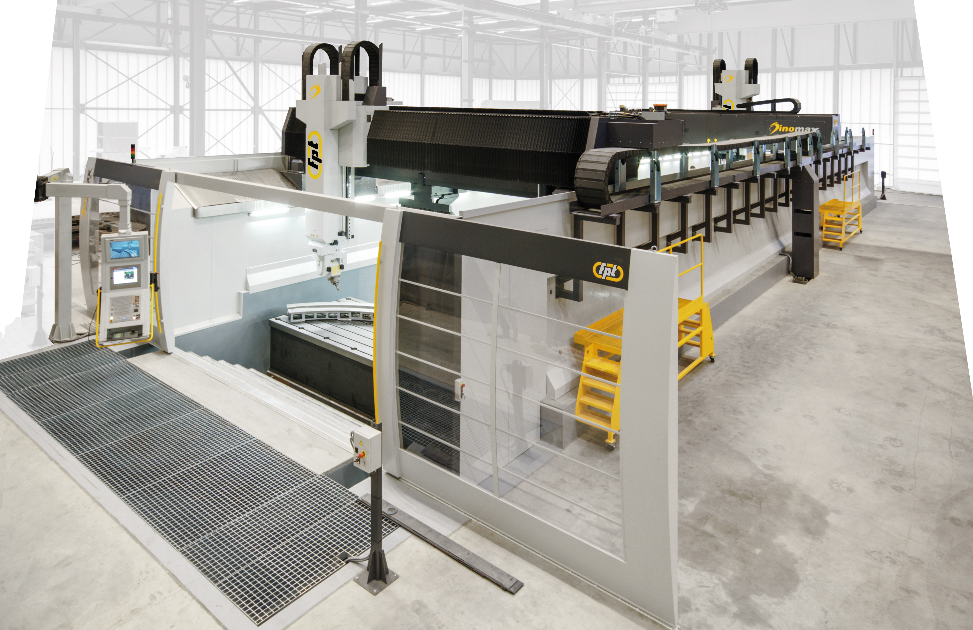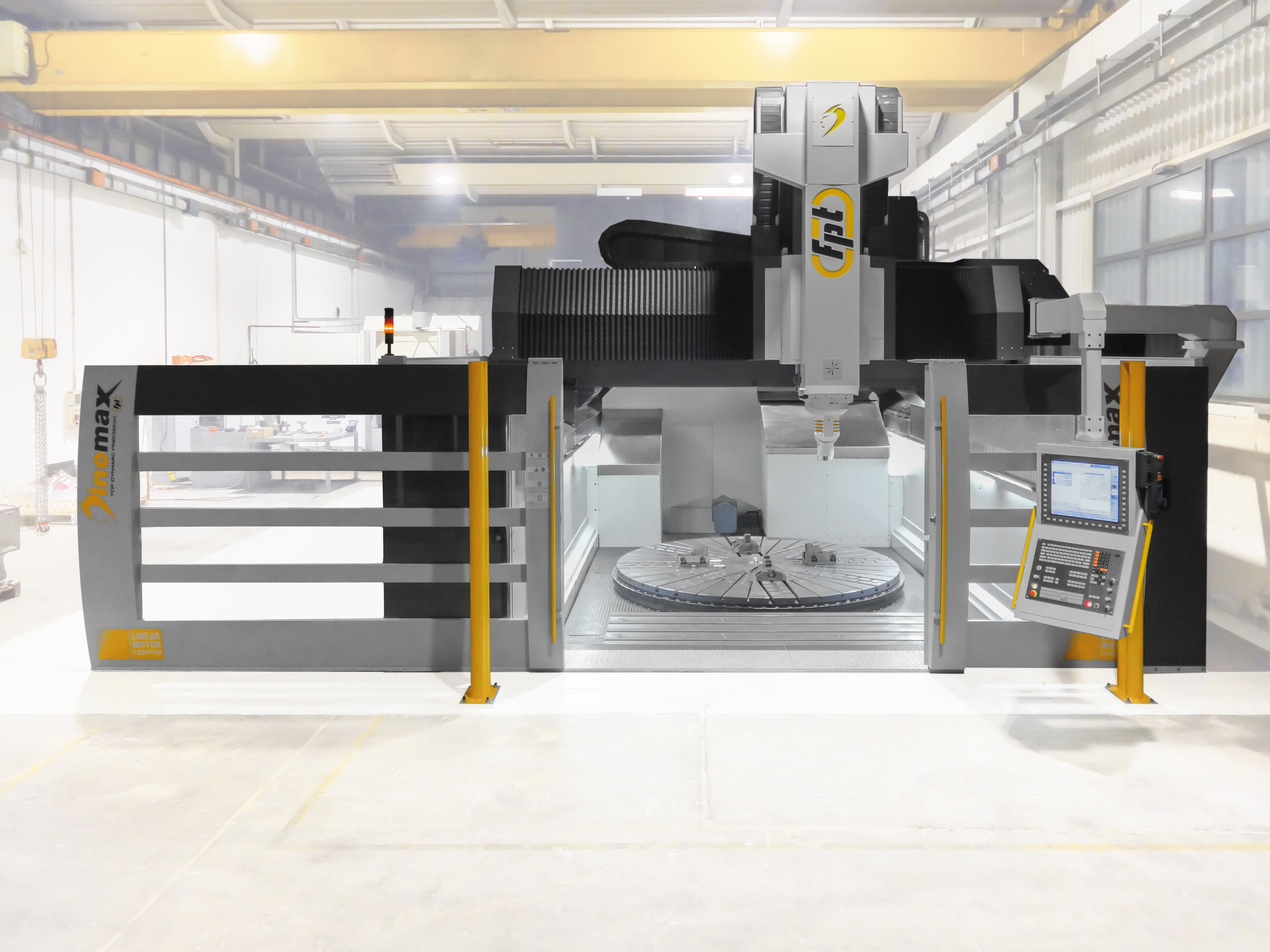 Dinomax is a large-format vertical milling machine designed for precision machining of oversized components. Built on a gantry-type architecture with FEM-optimized structures, Dinomax ensures maximum rigidity, vibration damping, and machining stability. Equipped with linear motors or dual-drive systems on the longitudinal and transverse axes, it delivers smooth, accurate motion with feedrates up to 50,000 mm/min. Ideal For |
